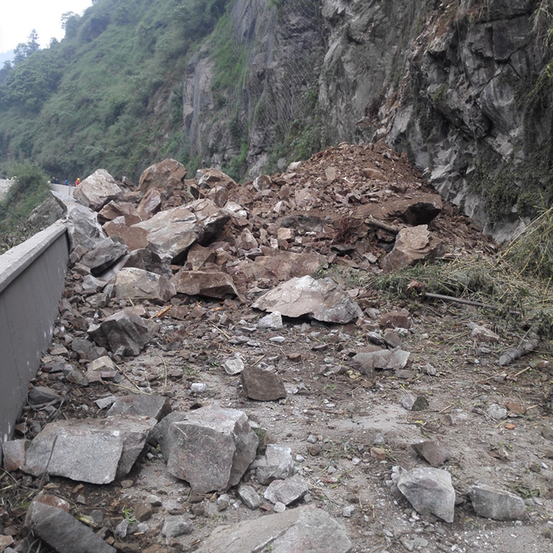 5月10日14點,國道318線天全縣境內(nèi)月亮灣大橋往二郎山方向約60m處公路內(nèi)側(cè)邊坡發(fā)生小規(guī)模崩塌,緊急搶修后交通恢復,但坡體上部仍殘留下較多的崩塌物,有隨時下滑掩埋路面再次阻斷交通的可能,途經(jīng)車輛極其危險,安全隱患極大。